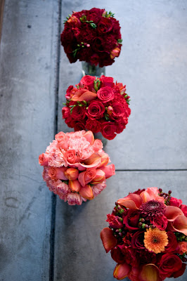 They started their pictures outside with the Smith Tower--Seattle's first skyscraper--in the background. That's it with the pyramid top, just over Julie's shoulder.The wedding was designed in red, orange, and black. Julie had the bridesmaid's bouquet done in burgundy, red, and orange, and hers was a combination of the three shades. We found graphic black and white linens at Pottery Barn to set off the table centerpieces, and they were surrounded by handblown votives from Glassybaby in a variety of shades.